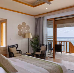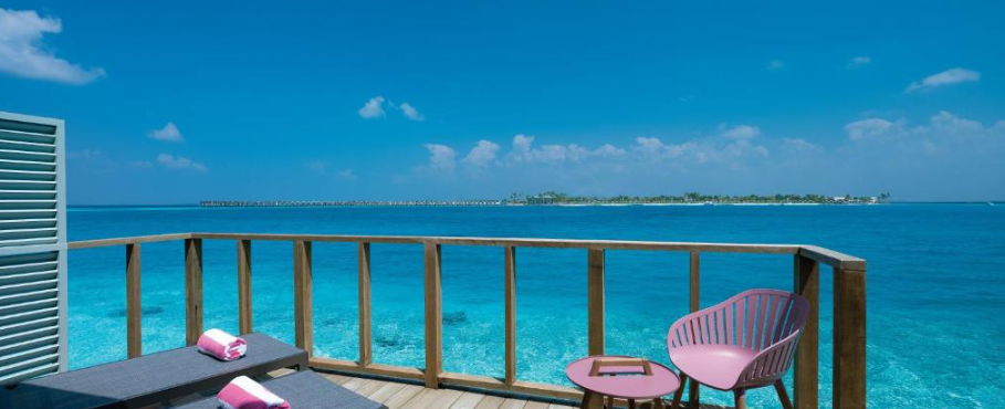 Nest Water Villa - Immerse in crystal-clear lagoon views and stylishly designed spaces. Everything about this one-bedroom overwater villa echoes tropical bliss. Contemporary and vibrant interiors feature soothing white walls, warm wooden floors, beautiful ocean-framing windows, and a plush bathroom with a seductive, deep-soaked bathtub and private overwater hammock.